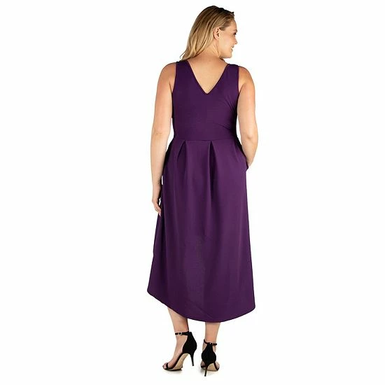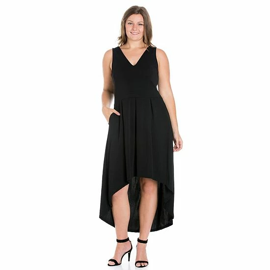 With its sleek plunging v-neck and fashionable high-low hem, this womens’ party dress with pockets from 24seven Comfort Apparel delivers a figure-flattering look you’ll love.