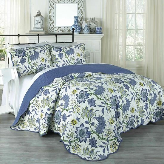 Update the look of your bedroom with this colorful and stylish Traditions by Waverly 3-piece Maldives quilt set. In porcelain.