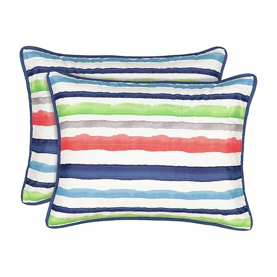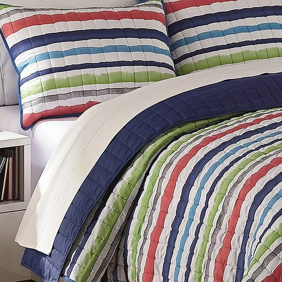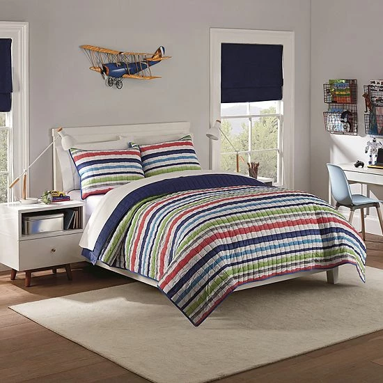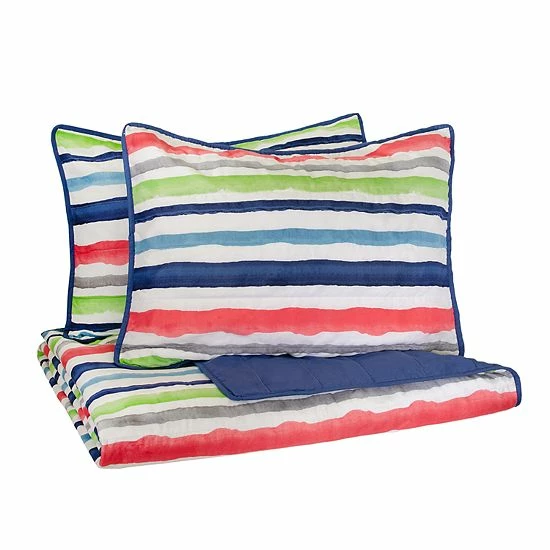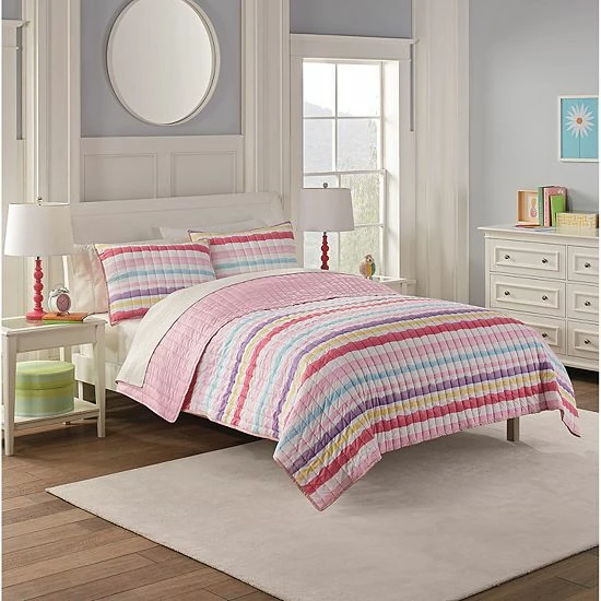 Bring their imaginations to life with whimsical bedding collections by Waverly Kids. This adorable froot loops quilt set features an allover brightly colored stripe motif. Reverse features solid navy or solid pink. Set includes reversible comforter and coordinating shams.