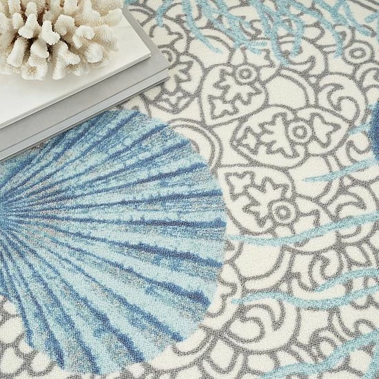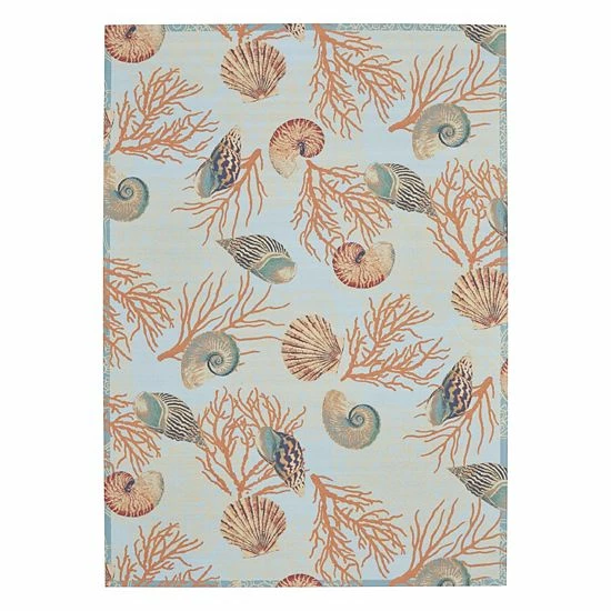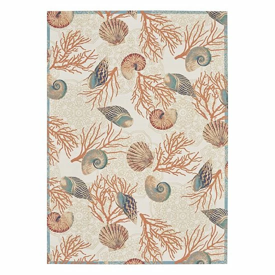- Coastal outdoor rug adds a fun and breezy vibe to your décor, Low-profile construction for easy placement both inside and outside, Machine-made from easy-clean polyester, Great for use in high traffic areas, including busy households with pets and kids, Easy-care fibers, Indoor/outdoor, Serged edges, Brilliantly detailed, nature-inspired rugs made from easy-clean, modern fibers