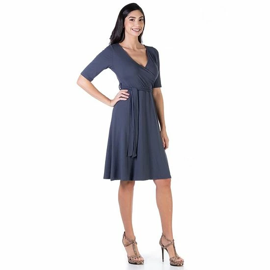 Pure romance! Get swept away in this women’s knee length faux-wrap dress from 24Seven Comfort Apparel.